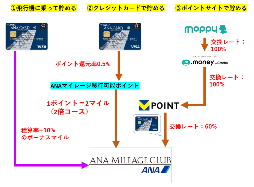 マイルを貯める方法は、飛行機に乗って貯める、クレジットカードを利用して貯める、ポイントサイトで貯める、の3つです。