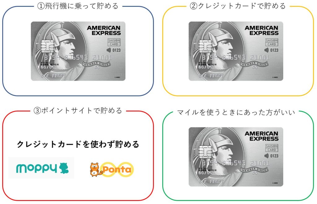 マイルを貯める方法は、飛行機に乗って貯める、クレジットカードを利用して貯める、ポイントサイトで貯める、の3つです。