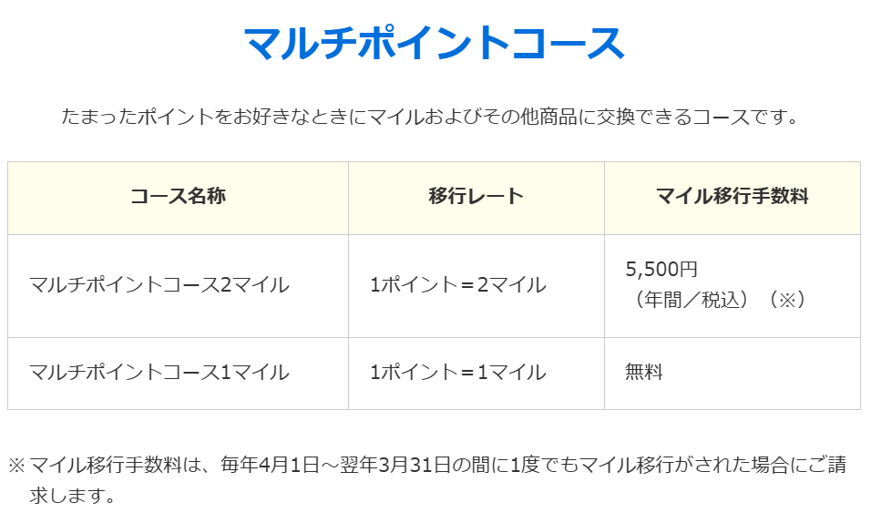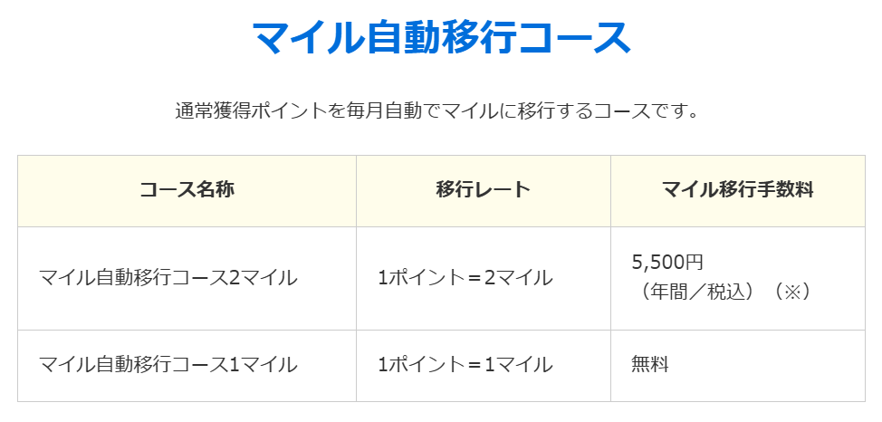 - 1ポイント=2マイル(2マイルコース)※年間移行手数料が5,500円かかる(一般カード)