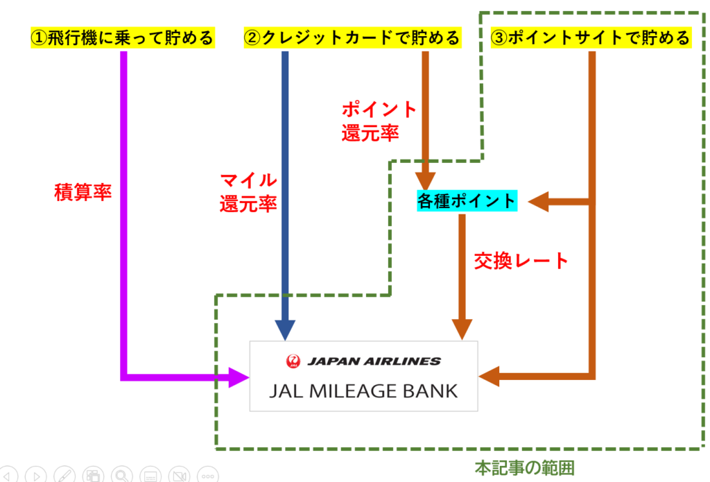 まずは、JALマイルを貯める仕組みの全体像を以下の図で確認してみましょう(※図では一部の細かな手順を省略していますが、各章で詳しく解説します)。